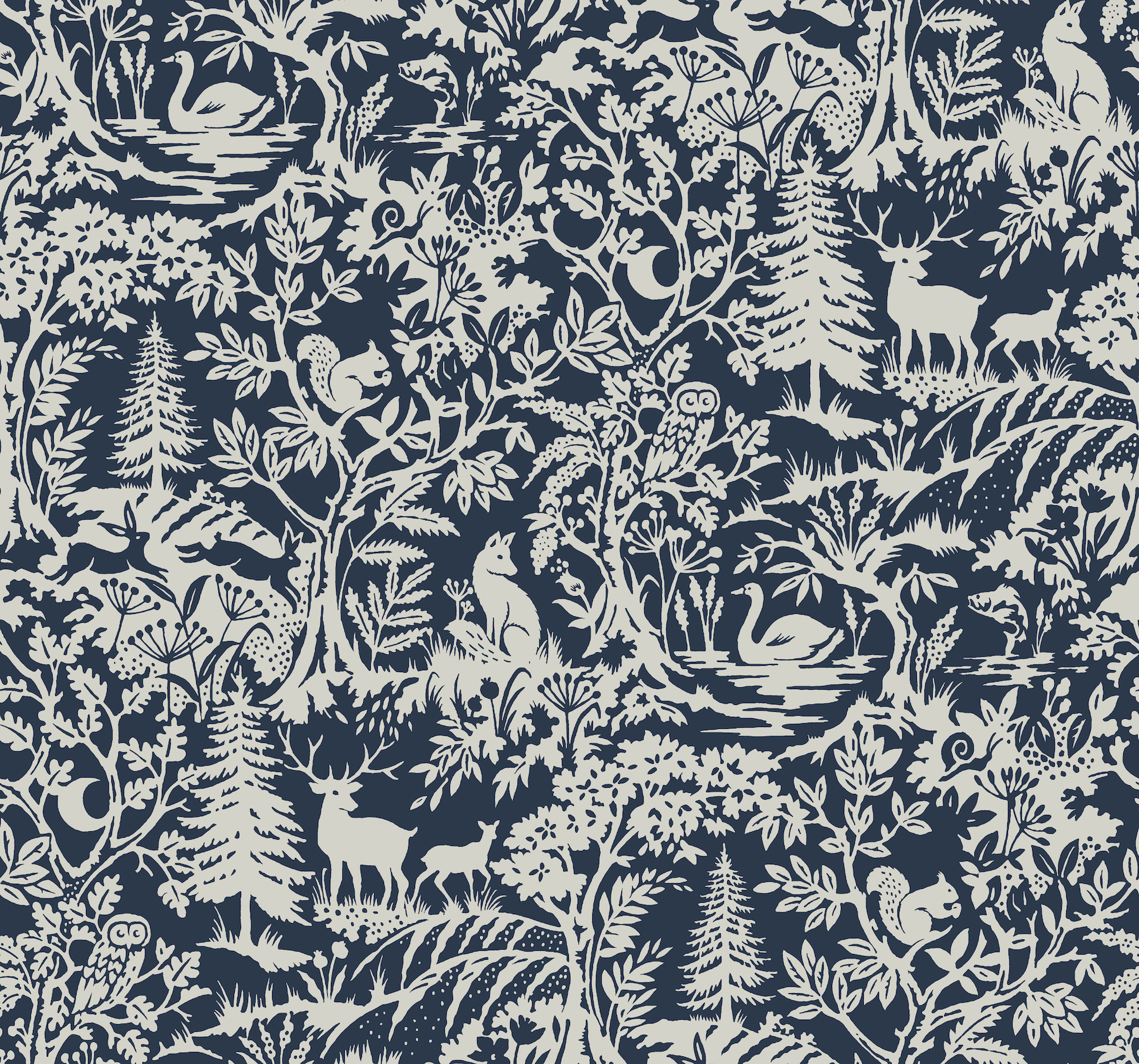 This scenic woodland wallpaper features deer, foxes, rabbits, squirrels and more exploring the forest, the details inked in deep navy and pale grey. Alrick is a prepasted, sure strip wallpaper measuring 27 inches wide by 27 feet long, covering approximately 60.8 square feet per roll.