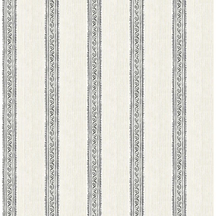 This striped wallpaper embodies the pattern's timeless appeal, with an extra embellishment of a wide sterling band etched with black climbing vines. The pinstriping is inked in beige against a cream backdrop. Mandevilla is an unpasted, non woven wallpaper measuring 20.5 inches wide by 33 feet long, covering approximately 56.4 square feet per roll.