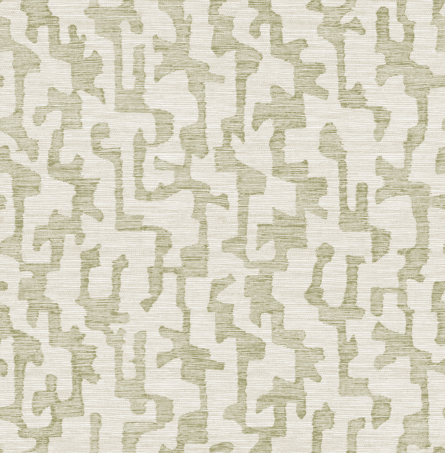 Faux grasscloth detailing adds depth and elegance to Cipher’s abstracted and maze-like forms. Featured here with moss green shapes against a beige backdrop. Cipher is an unpasted, non woven wallpaper measuring 20.5 inches wide by 33 feet long, covering approximately 56.4 square feet per roll.