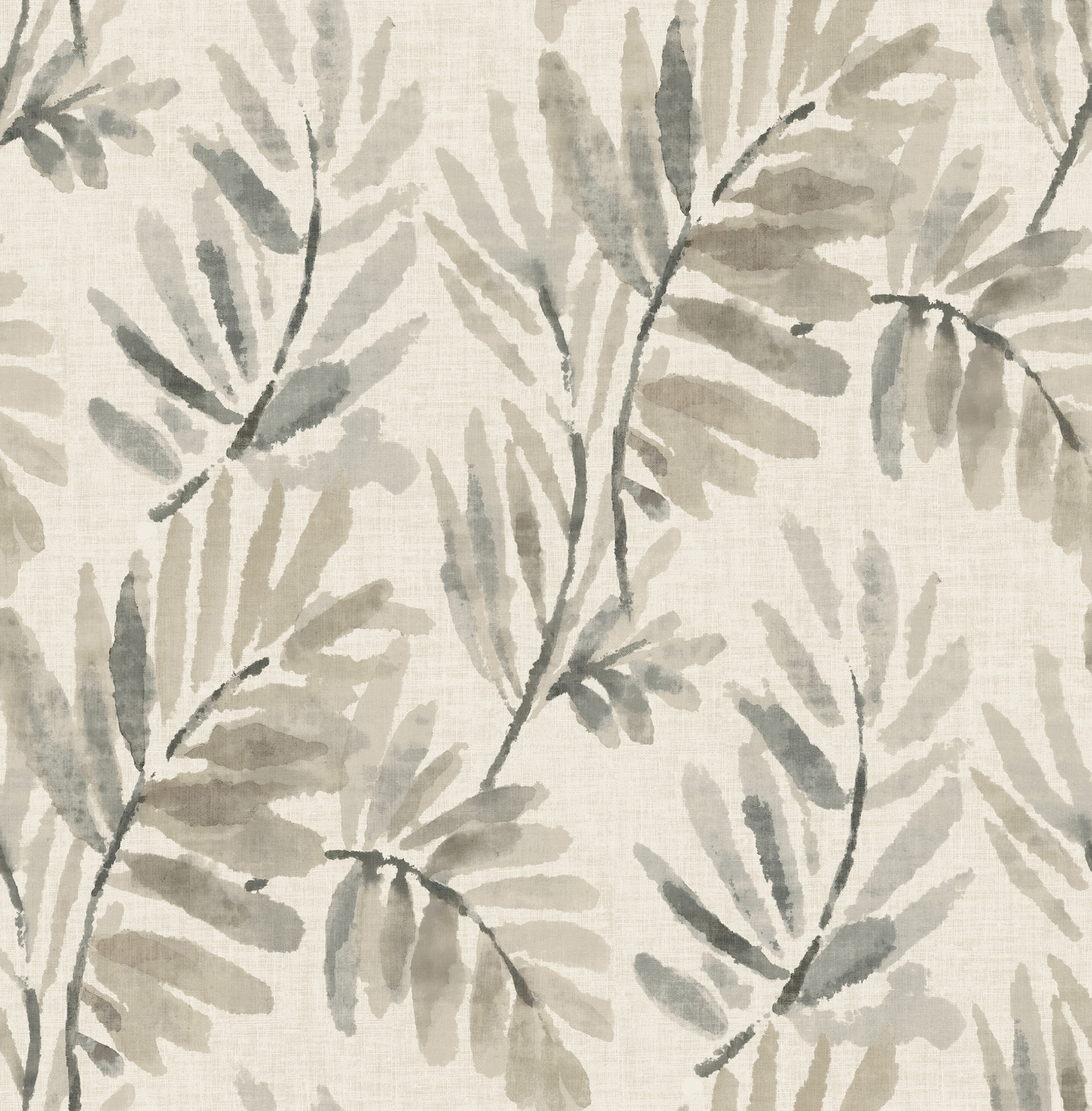 Airy ferns inked in soft watercolors along a linen-detailed backdrop infuse Serenade with the gentle serenity of the woods. Featured here in shades of grey and taupe against beige. Serenade is an unpasted, non woven wallpaper measuring 20.5 inches wide by 33 feet long, covering approximately 56.4 square feet per roll.