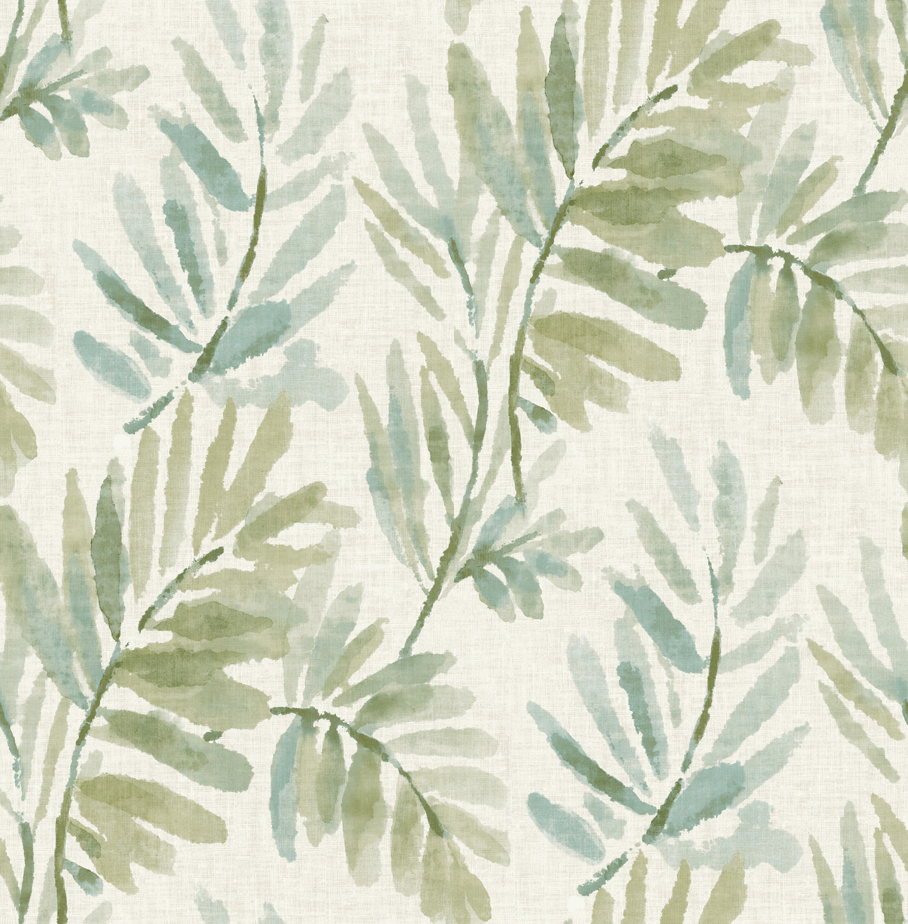 Airy ferns inked in soft watercolors along a linen-detailed backdrop infuse Serenade with the gentle serenity of the woods. Featured here in shades of pale blue and green against cream. Serenade is an unpasted, non woven wallpaper measuring 20.5 inches wide by 33 feet long, covering approximately 56.4 square feet per roll.