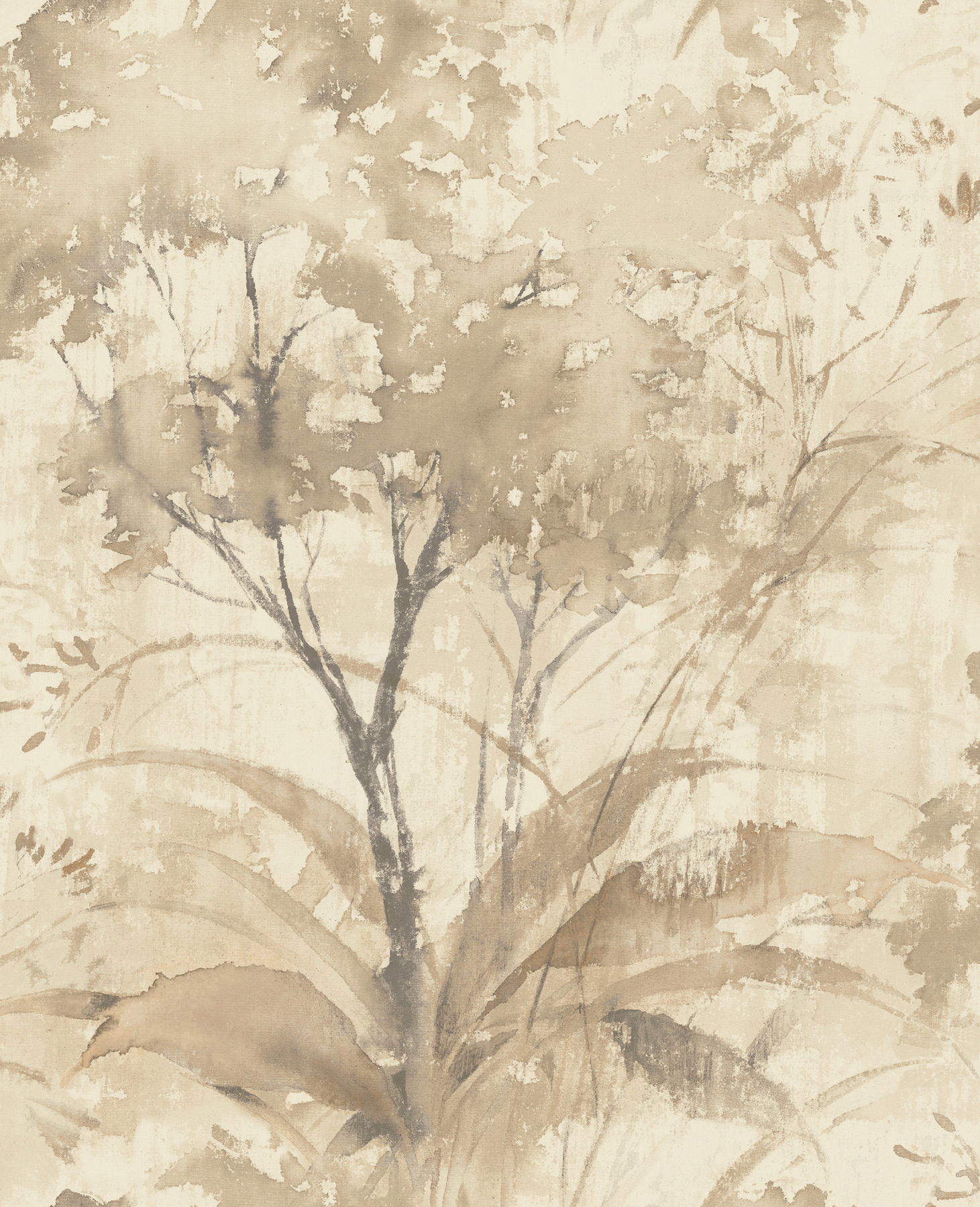See the forest through the trees with Mistwood’s dreamy woodland design featuring layers of watercolor greenery. Featured here in shades of brown, beige, and charcoal grey against ivory. Mistwood is an unpasted, non woven wallpaper measuring 20.5 inches wide by 33 feet long, covering approximately 56.4 square feet per roll.