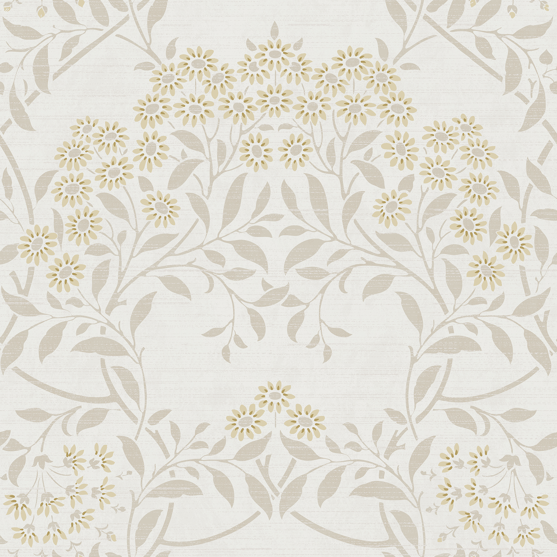 Enjoy modernized, Arts & Crafts era elegance with this gorgeous floral damask. Delicate buttery yellow blooms form a living canopy above the twining beige stems that complete the damask forms. Penelope is an unpasted, non woven wallpaper measuring 20.9 inches wide by 33 feet long, covering approximately 57.5 square feet per roll.