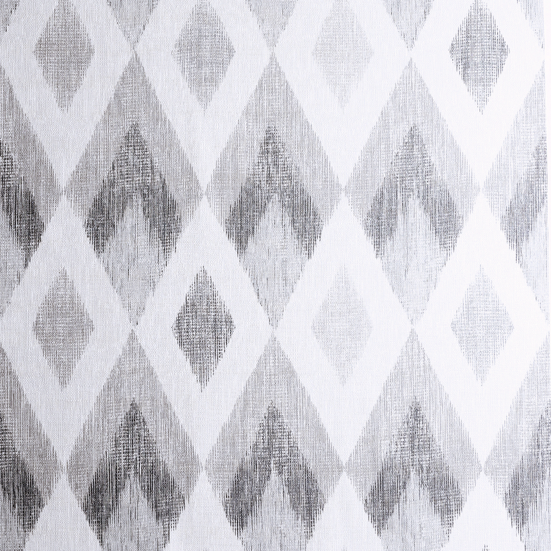 A classic diamond motif receives dimensional flair in this modern wallpaper. The shapes are finished with both subtle ikat detailing and a delicate sheen that catches the light. Featured here in a cool palette of grey, charcoal, and white. Fitzgerald is an unpasted, vinyl paper backed wallpaper measuring 20.9 inches wide by 33 feet long, covering approximately 57.5 square feet per roll.