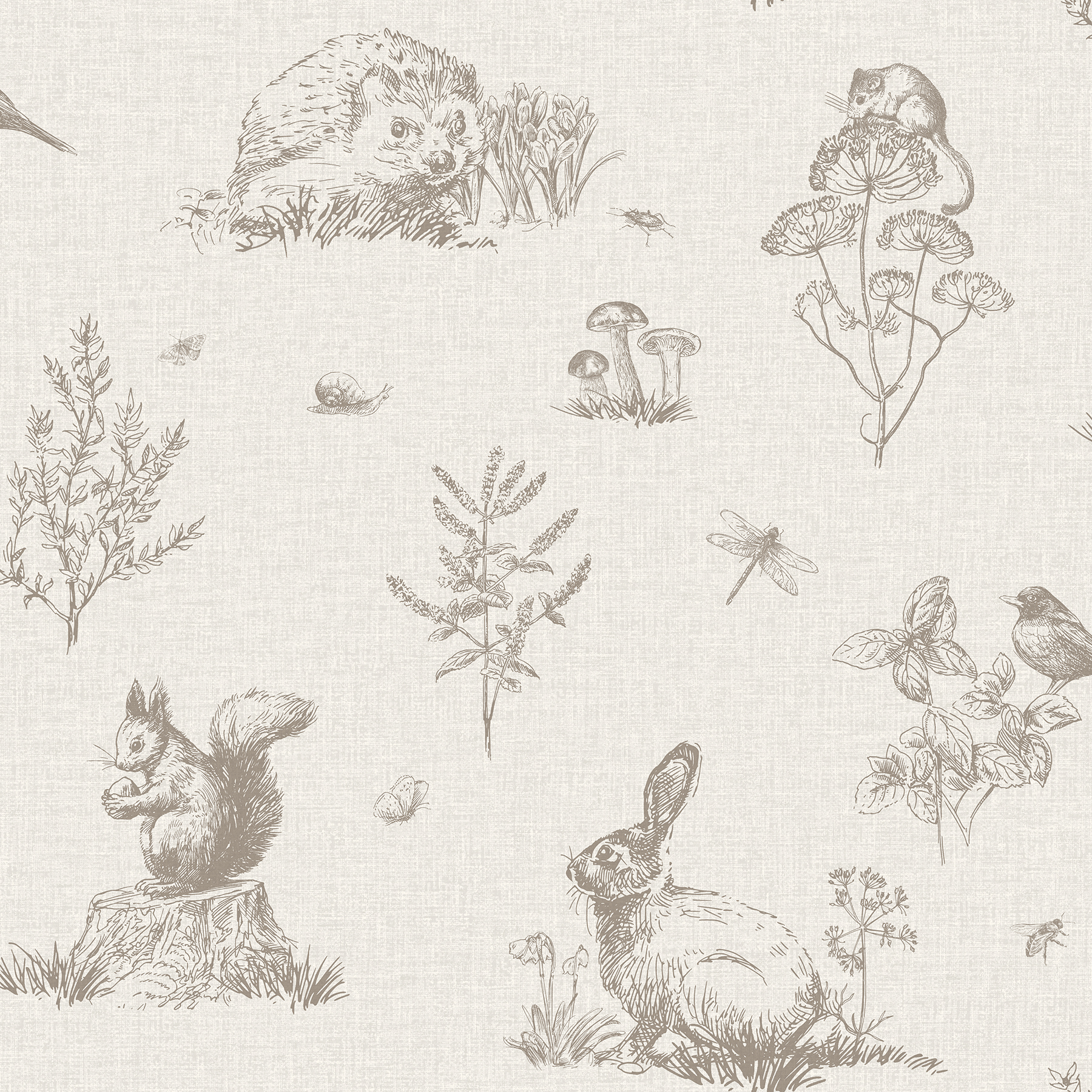Admire the tiny wonders of the woodlands with this charming wallpaper! Hedgehogs, squirrels, rabbits, mice, and birds visit meadow greenery, while even smaller critters and fungi fill the remaining space. The details are lovingly illustrated in beige against a cream backdrop imbued with linen detailing. Clawford is an unpasted, paper wallpaper measuring 20.9 inches wide by 33 feet long, covering approximately 57.5 square feet per roll.