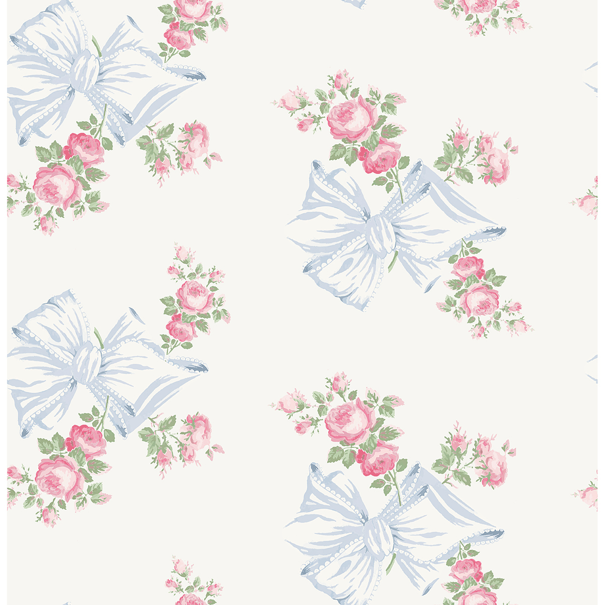 This vintage-inspired design offers both soft femininity and southern charm. Loopy blue bows loosely tie together clusters of pink cabbage roses. Rosa Beaux is an unpasted, non woven wallpaper.