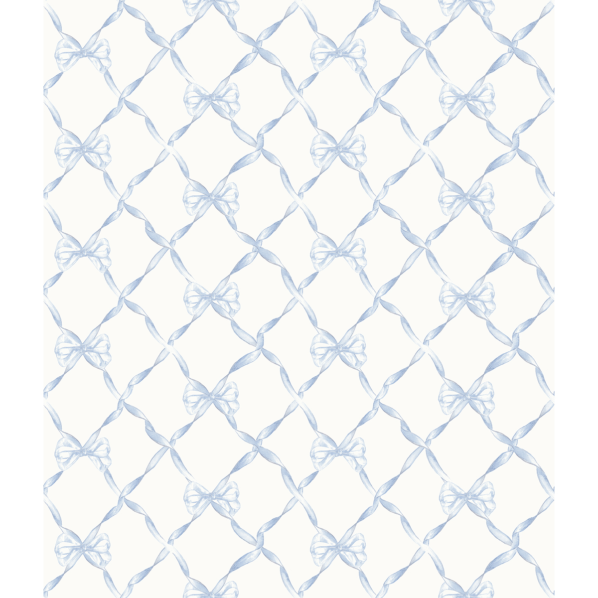 A long-standing Love Shack Fancy favorite, the baby bow design is given new life as wallpaper! The soft blue ribbon forms a woven diamond trellis connected by looping bows. Baby Bow is an unpasted, non woven wallpaper.
