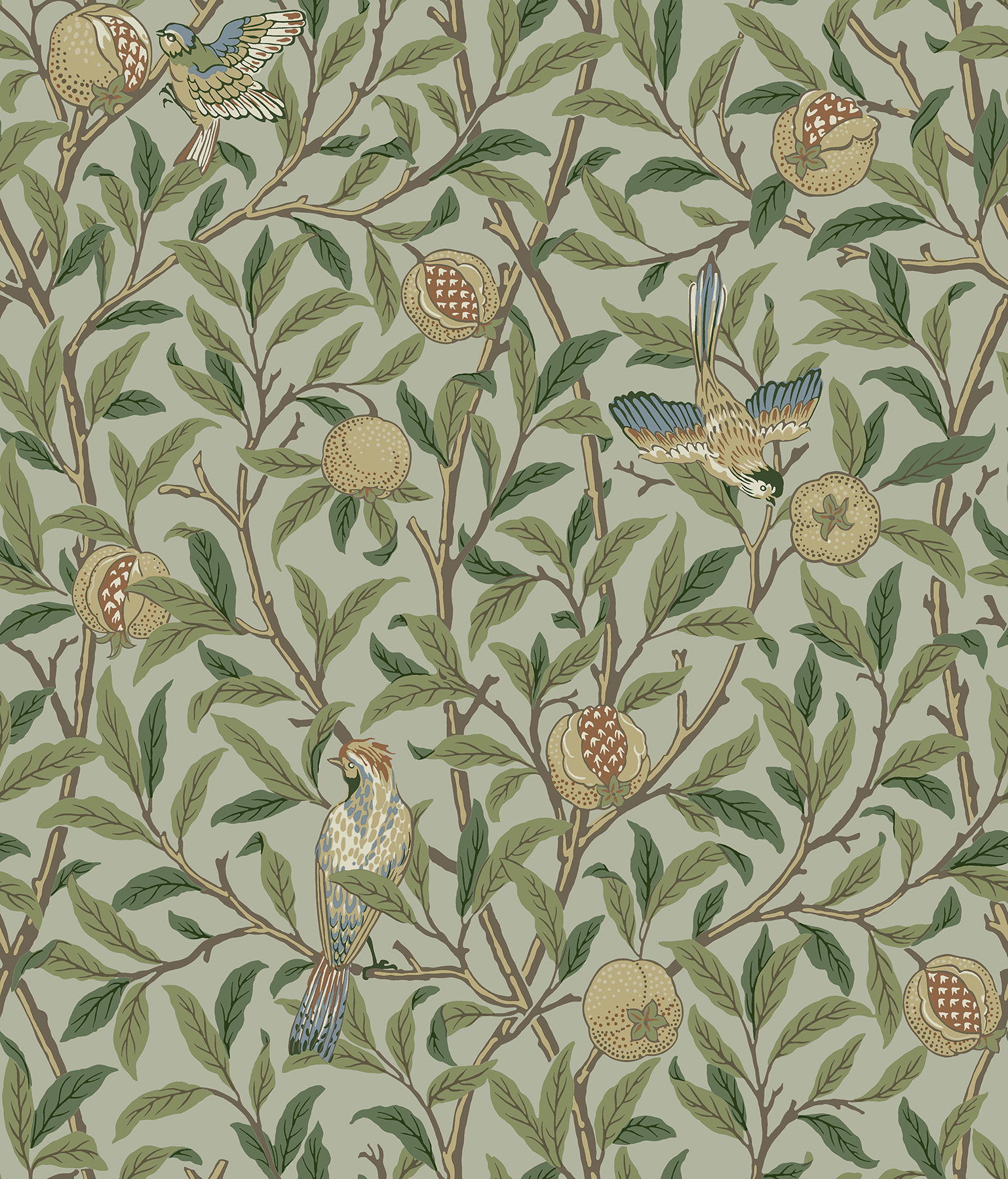 Bird and Pomegranate brings together birds, fruit, and winding branches in a flowing botanical arrangement. Its natural motifs and thoughtful structure create a timeless, quietly elegant pattern true to the Morris & Co. aesthetic. Bird and Pomegranate Bayleaf and Forest Peel and Stick Wallpaper comes on one roll that measures 20.5 inches wide by 18 feet long.