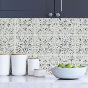 With a hand-painted design, these Moroccan-inspired peel and stick tiles are perfect for creating a boho look. Soft grey and charcoal hues lend to their versatile style. Catalan Peel & Stick Backsplash contains 4 pieces on 4 sheets that measure 10 x 10 inches.