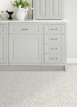 Brighten up kitchen and bathroom floors with these peel and stick tiles. A grey gothic-style motif effortlessly complements a crisp white background. Remy Peel & Stick Floor Tiles Peel and Stick Tiles contains 10 pieces on 10 sheets that measure 12 x 12 inches.